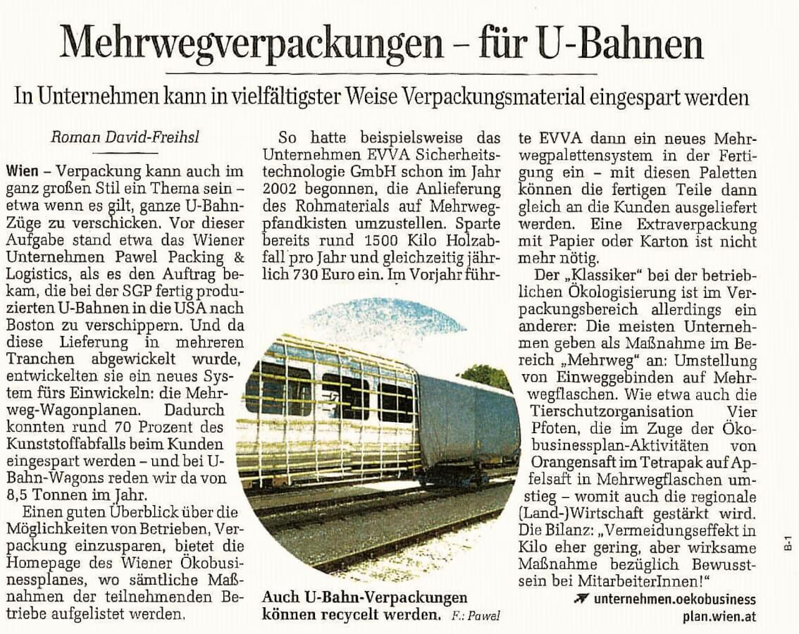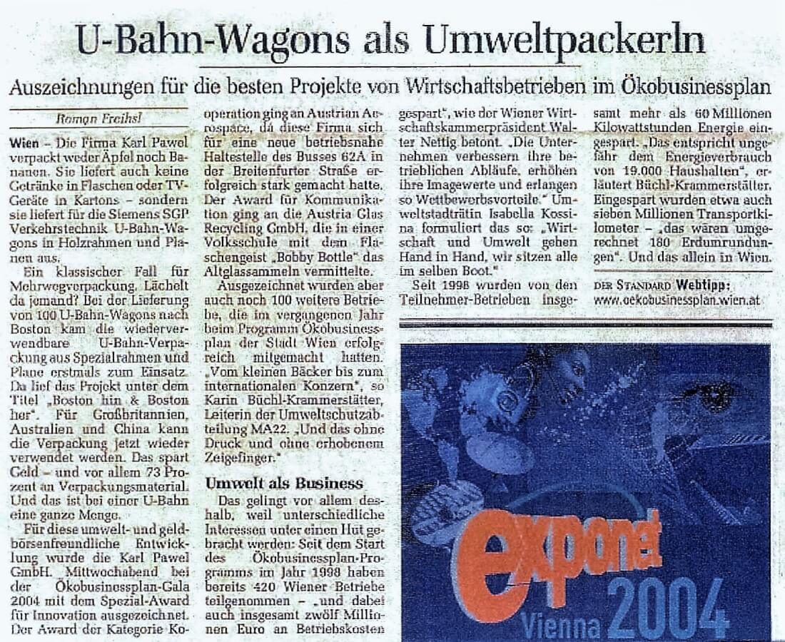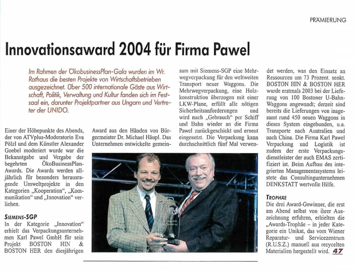 Der Innovationspreis 2004 wurde der Firma Pawel für weltweite Mehrwegverpackung für U-Bahn Waggons verliehen.