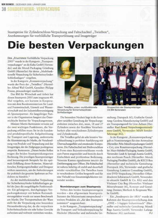 11/2009 Österr. Verkehrszeitung: Pawel erhält "Staatspreis Vorbildliche Verpackung 2009"