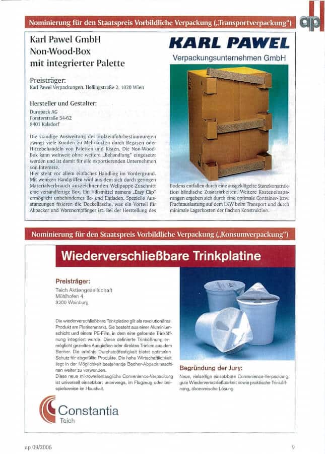 09/2006 Austropack: Nominierung für den Staatspreis Vorbildliche Verpackung